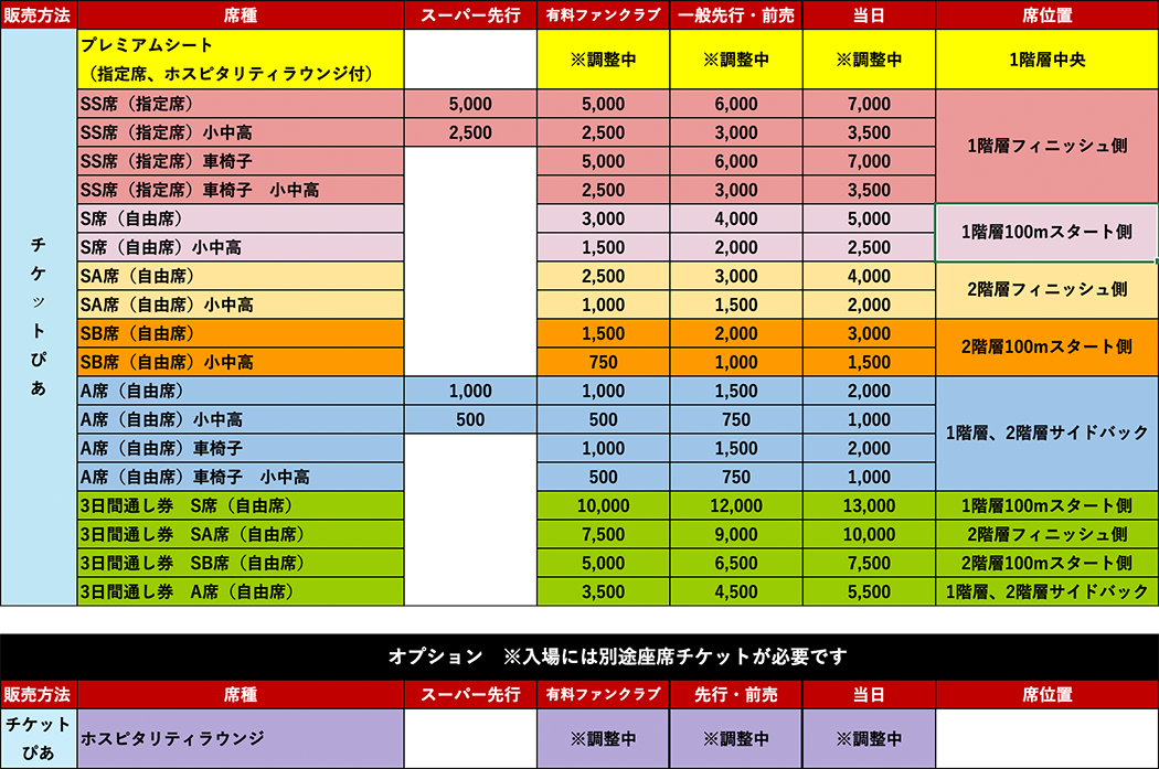 ※プレミアムシート、<オプション>ホスピタリティラウンジチケットは3月以降に販売を予定しております。