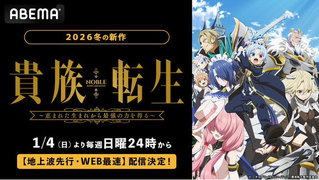 新しい未来のテレビ「ABEMA」は、2026年新作冬アニメ『貴族転生~恵まれた生まれから最強の力を得る~』を、2026年1月4日(日)から毎週日曜日夜24時より地上波先行・WEB最速配信いたします。