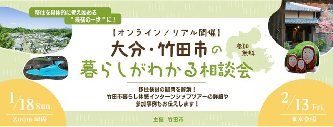 大分県竹田市(受託会社:株式会社Asian Bridge)は、都市部の若者が地域での暮らしと働き方を体験する「竹田市暮らし体感インターンシップツアー」への関心を高め、興味のある方が気軽に相談できる機会として、「大分・竹田市の暮らしがわかる相談会」を開催します。自然豊かなまち“竹田市”の暮らしと仕事について、 Uターン・移住経験のある担当者とオンライン、東京会場の2回開催します。自然豊かな地方で暮らしたい方、子育てをしたい方、UIJターン就職、竹田市周辺での就職を検討中の方など、少しでも興味がある方は、お気軽にお申し込みください。