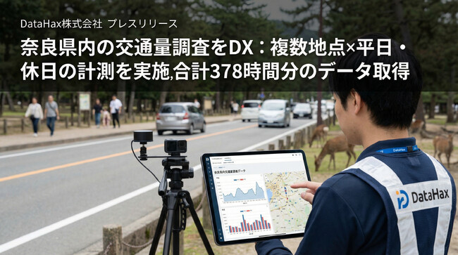 DataHax株式会社(本社:東京都新宿区)は、奈良県内にて交通量調査を実施しました。公園出入り口における計測(平日4箇所・休日5箇所、合計90時間)に加え、県内道路での計測(地点非公開:平日12箇所・休日12箇所、合計288時間)を行い、合計378時間の観測データを取得しました。平日・休日の比較を前提に、複数地点の交通実態を把握できる調査設計で実施しています。