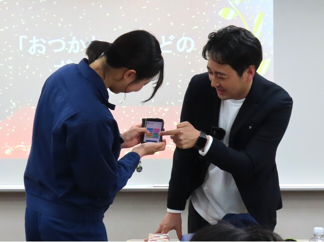 練習船「鳥羽丸」実習において、学生(左)が「クラウド型労務管理システム」を体験する様子。右は中村事業部長