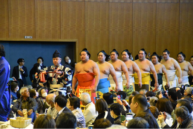 力士たちが七五調のリズムや独特の掛け声と共にユーモアを交えながら歌を披露しました。[画像3: https://prcdn.freetls.fastly.net/release_image/102493/134/102493-134-bf3bc776a51a4f3b87472099c5bf385d-3900x2619.jpg?width=536&quality=85%2C75&format=jpeg&auto=webp&fit=bounds&bg-color=fff ]