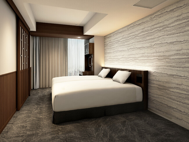 このたび、ホテルグレイスリー札幌の高層階エグゼクティブフロアに「デラックスツインルーム」32室が誕生いたします(うち16室は2月完成予定)。客室面積30平方メートル のゆったりとした空間設計に、北海道の景観の美しさを物語として体験していただけるよう、「雪景色」をテーマにした空間デザインを採用。厳冬を象徴する“吹雪”をデザインモチーフにした客室タイプでは、濃淡の木製家具をバランスよく配置し、吹雪の中の温もりを感じられる空間に仕上げています。