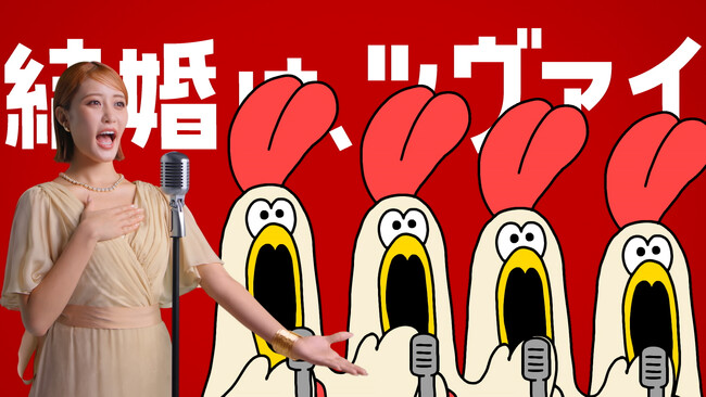 今回は、王林さんのパワフルな歌声やパフォーマンスが婚活を頑張る人たちの背中を押してくれるCMに。公式キャラクター“コケッコン”とともに様々なエールの形を表現しています。