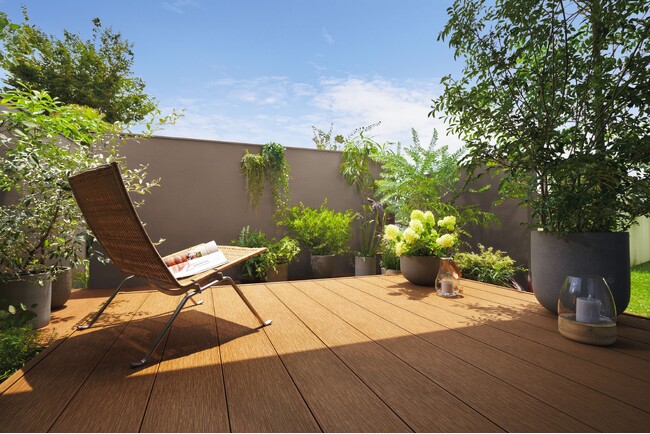 従来品と同様に硬度の高いポリプロピレンを原料とし、高い耐久性(耐候性・耐腐朽性・耐水性)と滑りにくさを確保。熱や衝撃に強く、日差しや荷重にさらされる屋外空間でも安心して長く使えます。また、原料の木粉は社内で出る木の端材を有効活用して省資源化に貢献します。デッキ材のすき間にモノが落ちない構造など、独自の特長でユーザーの要望に対応しています。