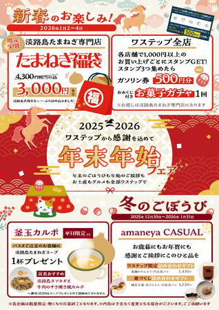 淡路ハイウェイオアシスなどを運営する、ユーアールエー株式会社(所在地:兵庫県淡路市大磯6番地)が、 淡路島東海岸で2023年グランドオープンした、淡路島のいいところ、おいしいものをぎゅっと集めた大型総合ショッピングゾーン『waSTEP AWAJISHIMA』では、感謝を込めて、「年末年始フェア」を実施します!たまねぎ専門店の福袋やスタンプ集めてガソリン券GETは、 【2026年1月2日(金)~4日(日)】です。