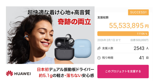 華為技術日本株式会社(ファーウェイ・ジャパン)は、2025年12月22日(月)時点で、クラウドファンディングサイト「GREEN FUNDING」にて12月12日(金)より支援受付を開始したイヤーカフ型イヤホン『HUAWEI FreeClip 2』が、10日間で支援総額5,500万円を突破し、支援人数は2,500人を超えましたことをお知らせします。