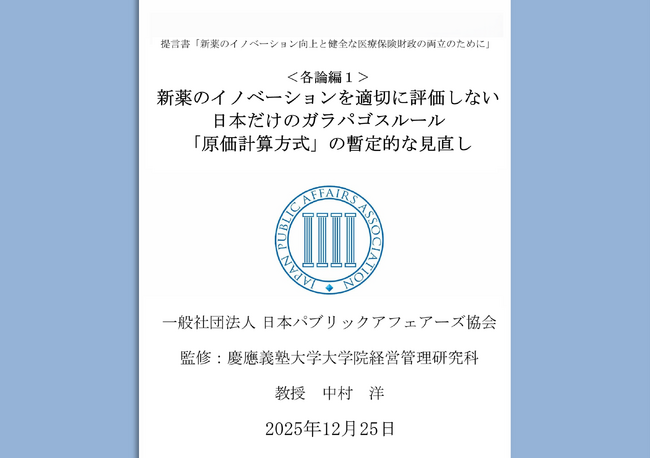 一般社団法人日本パブリックアフェアーズ協会は2025年12月25日、政策提言書「新薬のイノベーションを適切に評価しない日本だけのガラパゴスルール『原価計算方式』の暫定的な見直し」を発表しました。このレポートは、中村洋教授(慶應義塾大学大学院経営管理研究科)監修の下、弊協会アドバイザーの武藤正樹 日本医療伝道会衣笠病院グループ理事、印南一路名誉教授(慶應義塾大学総合政策学部)の助言を得て、日本パブリックアフェアーズ協会において作成したものです。