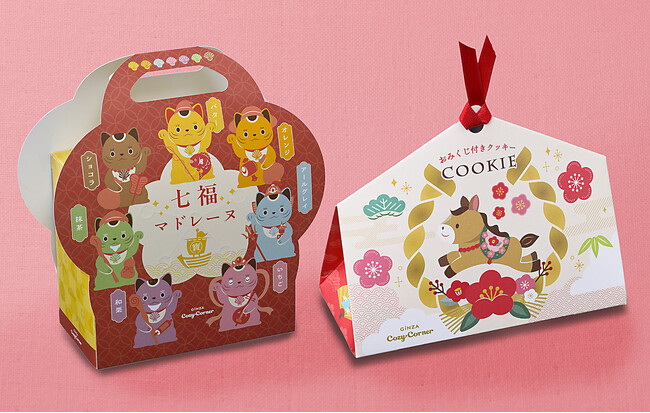 運だめしができて願いごとも書ける「おみくじ付き絵馬クッキー(10個入)」はクッキー2種を、”七福神に扮した招き猫“デザインの「七福マドレーヌバッグ(7個入)」は人気のマドレーヌ7種を、スイーツ柄ブランケットが付いた「新春福袋(28個入、グッズ付き)」はクッキー4種とマドレーヌ5種をアソートしました。
