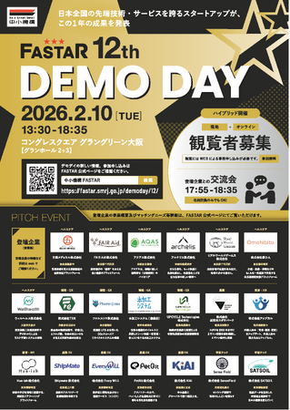 独立行政法人中小企業基盤整備機構(理事長:宮川正 本部:東京都港区)は、アクセラレーション事業FASTARのピッチイベント「FASTAR 12th Demo Day」を2026年2月10日(火曜)に開催します。