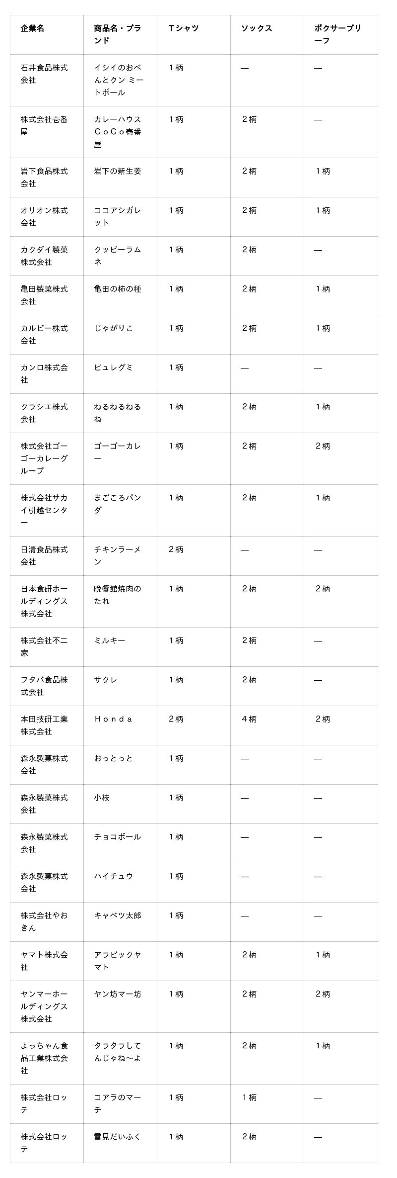 2026年は22社とコラボし、石井食品株式会社の「イシイのおべんとクン ミートボール」、森永製菓株式会社の「ハイチュウ」、ヤンマーホールディングス株式会社の「ヤン坊マー坊」が初登場します。Tシャツは従来のXSから2XLに加えて、大きいサイズ向けのブランド「グレイテス」で3Lから5Lを品揃えし、サイズバリエーションを増やしています。さらにTシャツ以外のアイテムとして、ソックスとボクサーブリーフを販売し、ソックスは17社37柄、ボクサーブリーフは12社16柄を展開します。企業の商品やキャラクターをファッションとして楽しむスタイルを、アイテムを増やして提案します。