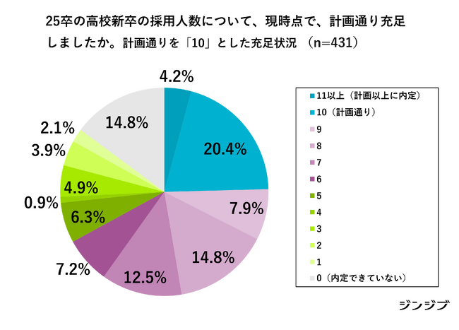 4.25卒の高校新卒の採用人数について、現時点で計画通り充足しましたか。計画通りを「10」とした充足状況を教えてください。 (n=431)[画像5: https://prcdn.freetls.fastly.net/release_image/48030/224/48030-224-6da9e9506754bd87cd3e2cdb6198ecb7-3900x2229.png?width=536&quality=85%2C75&format=jpeg&auto=webp&fit=bounds&bg-color=fff ]