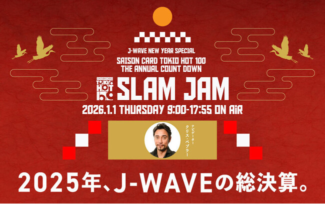ラジオ局J-WAVE(81.3FM)では、2026年1月1日(木・祝)9:00~17:55、2025年の東京No.1ヒットソングを決める特別番組『J-WAVE NEW YEAR SPECIAL SAISON CARD TOKIO HOT 100 THE ANNUAL COUNT DOWN SLAM JAM』を、クリス・ペプラーのナビゲートで放送いたします。