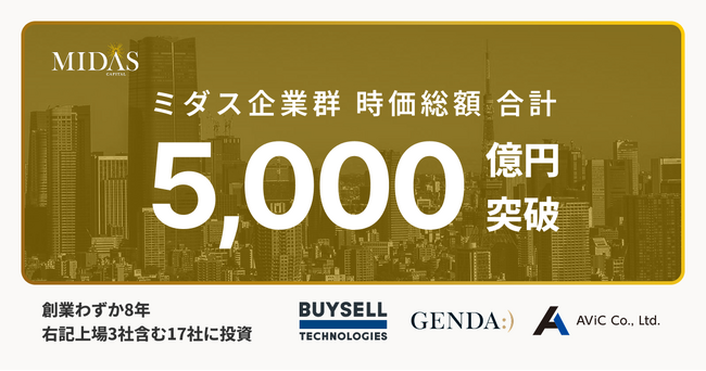 株式会社ミダスキャピタル(本社:東京都港区、代表取締役社長:吉村英毅、以下「当社」)は、投資先企業群時価総額の総計が5,000億円 *を突破したことと当社WEBサイトをリニューアルしたことをお知らせいたします。