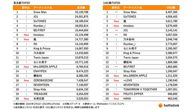 Snow Man、JO1、SixTONES、嵐など… ホットリンク、2025年にXで話題になったアーティストを調査