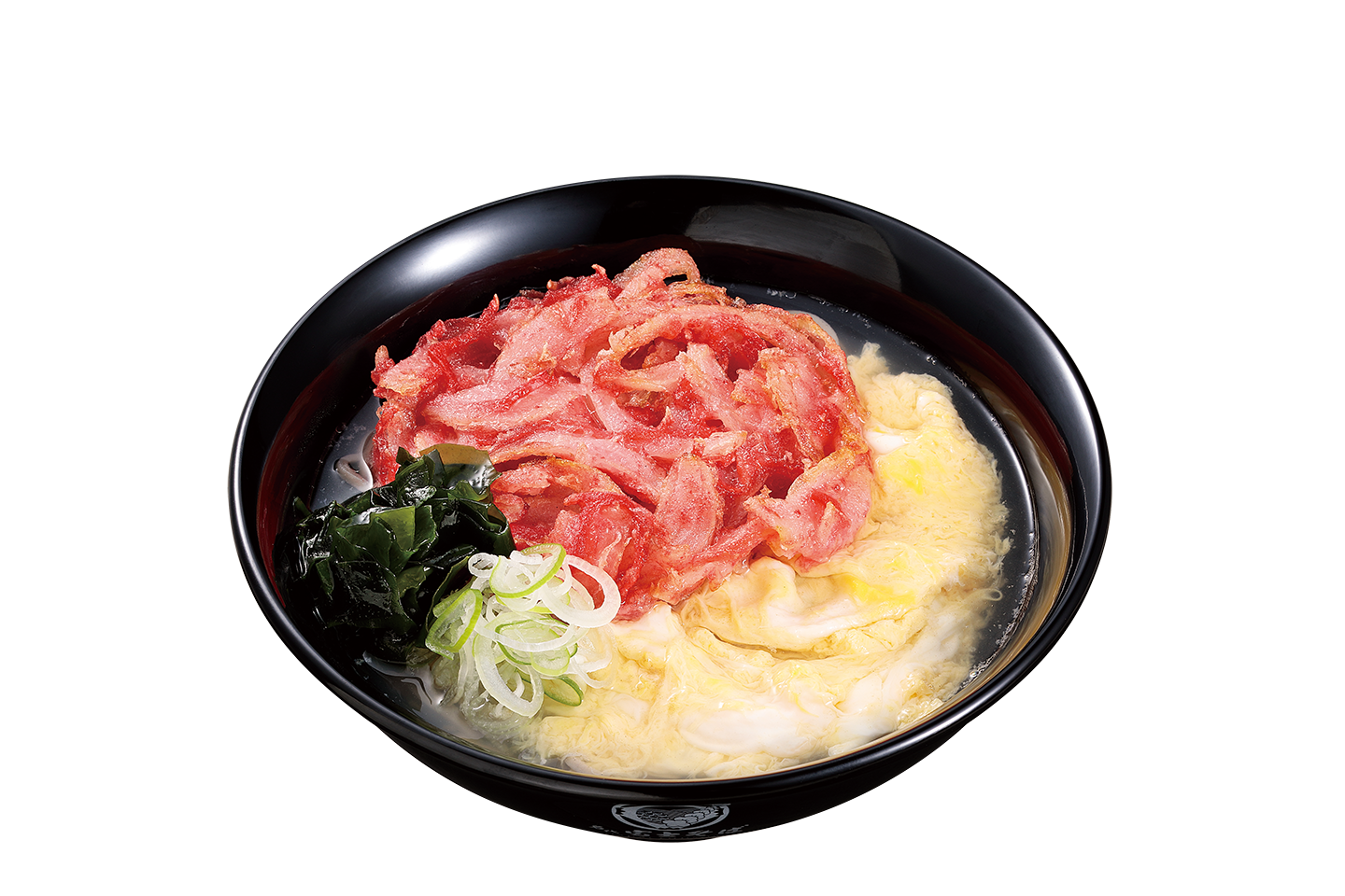 塩だしつゆに明石焼きをヒントとしたふわふわ玉子と名物“紅生姜天”をトッピングしました。ふわふわ玉子が塩だしと融合し、紅生姜天が味わいとしてアクセントになっています。“紅白”の見た目はお正月にぴったりです。