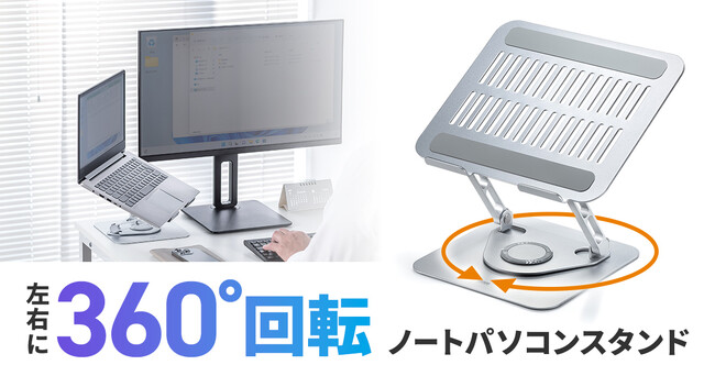 360°自由に回転できる台座を搭載し、スタンドの向きをスムーズに調整できます。他の人に画面を共有したり、メインモニターの横にノートパソコンを設置する際に便利です。