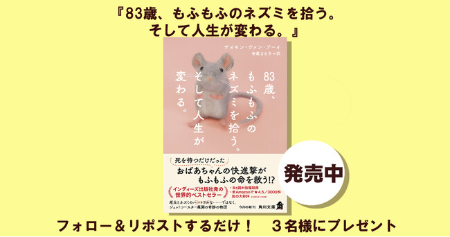 [画像2: https://prcdn.freetls.fastly.net/release_image/7006/18442/7006-18442-37369fa2aa8a7388e9e8f359fa33ef29-1000x1419.jpg?width=536&quality=85%2C75&format=jpeg&auto=webp&fit=bounds&bg-color=fff ]『83歳、もふもふのネズミを拾う。そして人生が変わる。』(角川文庫)