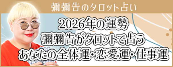 今TVで話題の人気占い師『彌彌告(みみこ)』。現在、月額公式サイト『彌彌告のタロット占い』にて、『2026年の運勢|彌彌告がタロットで占うあなたの全体運・恋愛運・仕事運』を公開中です。ぜひこの機会にご利用ください。