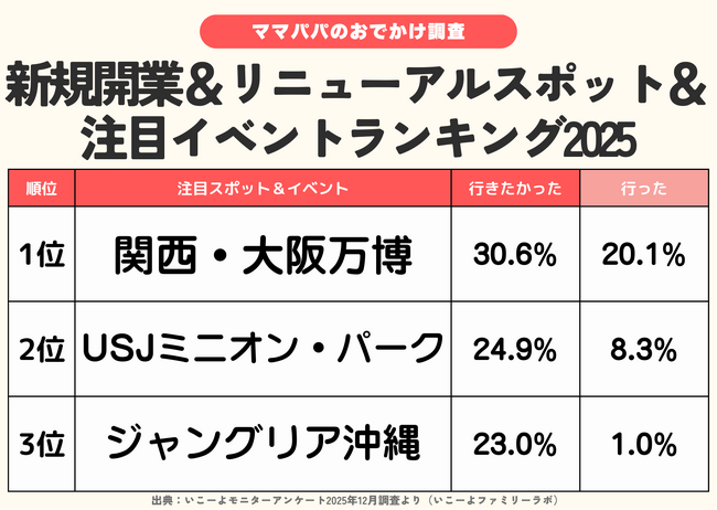 発表!2025年ニューオープンスポット&注目イベント行った?行かない?ランキング ジャングリア沖縄は?関西大阪万博は?/【2025⁻2026年年末年始の子育て世帯の実態と予測調査第4弾】