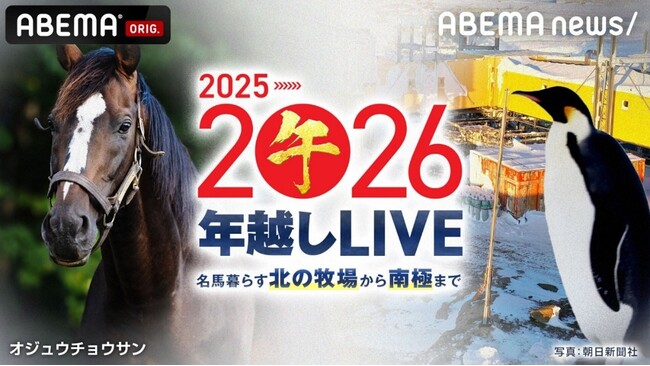 番組概要:コンセプトは「生き抜いた。さあ、次の一歩だ」。午(うま)年を迎える瞬間は、引退した名馬たちが暮らす北海道日高町の「Yogiboヴェルサイユリゾートファーム」から生中継。オジュウチョウサンやアドマイヤジャパンなど、時代を生き抜いたレジェンド競走馬の今をお伝えします。さらには、14000キロ離れた南極の様子もライブ配信。観測隊に同行取材する朝日新聞の記者がお伝えします。日本が、世界が、そして地球が2026年はどんな一歩を歩むのか?ABEMA NEWSキャスターの楪望と辻歩とお届けします。