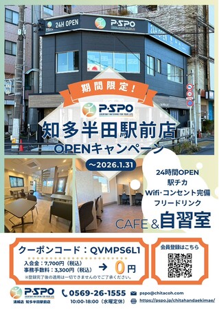 「P・SPO 知多半田駅前店」では、オープンを記念した期間限定キャンペーンを実施しています。期間中は、入会金および事務手数料が無料となり、気軽に利用を開始できる内容となっています。