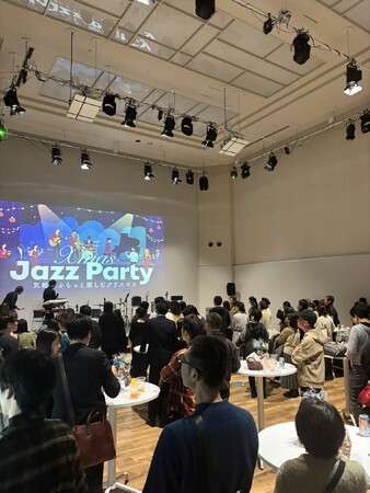 会場では、照明と映像演出の中で本格的なジャズライブが行われ、参加者の皆さまはビール・ワイン・ソフトドリンクなどのフリードリンクや軽食を片手に、思い思いのスタイルで音楽を楽しまれていました。各回はそれぞれ約100名と、多くの皆さまにご参加いただき、ハイテーブルを中心としたスタンディング形式により、自然な会話と交流が生まれる賑わいのある空間となりました。