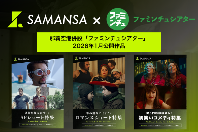 株式会社SAMANSA(本社:東京都渋谷区、代表取締役社長:岩永 祐一、共同代表:遠山 孝行)は、有限会社チャオジャパントレーディング(本社:沖縄県那覇市、代表取締役社長:洲鎌 一馬)が那覇空港で展開する「ファミンチュシアター」において1月1日より、新たな作品を公開することをお知らせいたします。今月は『笑う門には福来る!初笑いコメディ特集』『運命を揺るがす!?SFショート特集』 『恋の勝負に出よう!ロマンスショート特集』の3パッケージ、計6本を公開。