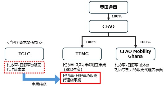 一方、ガーナでは、豊田通商グループと資本関係のないTGLCがトヨタおよび日野の代理店を担い、豊田通商グループ直営の代理店であるCFAO MOBILITY GHANAは、トヨタおよび日野以外のマルチブランドを扱ってきました。