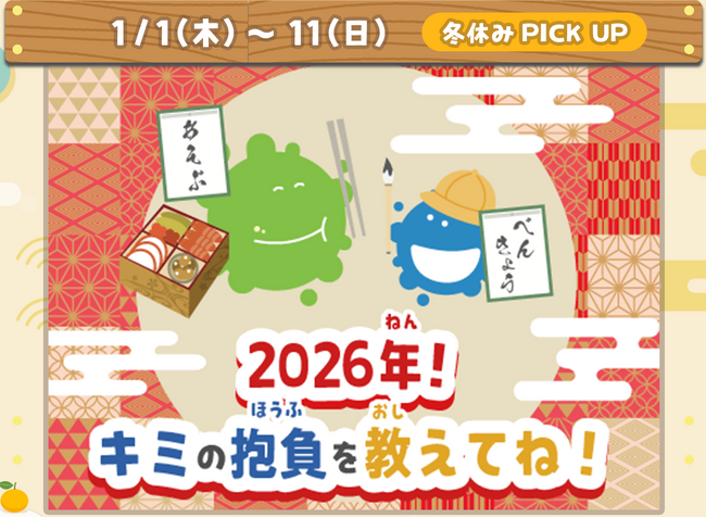 【2026年!キミの抱負を教えてね!】子どもたちが「今年どんなことに挑戦したいか」「どんな自分になりたいか」を考え、自由に表現するオンライン企画です。表現方法は、絵や工作など、なんでもOK。完成した作品の画像データを"みらいいパーク"内の「コレクションドーム」に提出します。応募作品の中から選ばれた作品は、公式Instagramにて公開予定。作品づくりを通して自己表現力を育むとともに、新年の前向きな一歩を応援します。