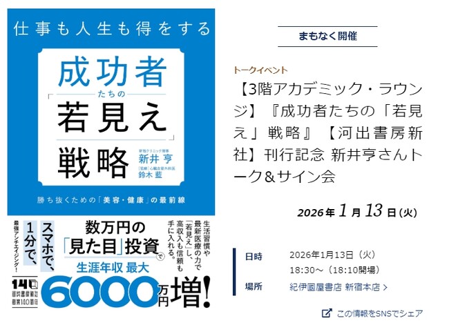 ARAIインベストメント代表の新井亨が医療法人理事として、2026年1月13日に『成功者たちの若見え戦略』出版記念イベント(紀伊國屋書店新宿本店3階アカデミック・ラウンジ)を開催いたします。