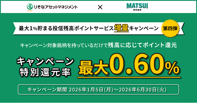 松井証券株式会社(本社:東京都千代田区、代表取締役 社長執行役員:和里田 聰、以下「当社」)は、2026年1月5日(月)より、りそなアセットマネジメント社の2銘柄を対象に、「最大1%貯まる投信残高ポイントサービス増量キャンペーン」を実施します。