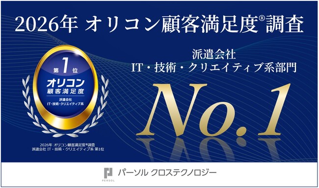 「はたらいて、笑おう。」をビジョンに掲げるパーソルグループで、テクノロジーソリューション事業を手がけるパーソルクロステクノロジー株式会社(本社:東京都新宿区、代表取締役社長:正木 慎二、以下:パーソルクロステクノロジー)は、オリコン株式会社(本社:東京都港区、代表取締役社長:小池 恒、以下:オリコン)が2026年1月5日(月)に発表した『2026年 オリコン顧客満足度(R)調査 派遣会社 IT・技術・クリエイティブ系』で第1位を獲得したことをお知らせします。
