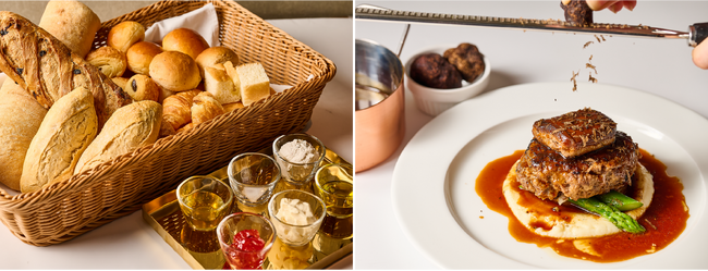 メインの主役は、黒毛和牛の旨味を存分に味わえる「黒毛和牛のハンバーグステーキ ロッシーニ風」と「リブロースのステーキ ロッシーニ風」。濃厚なフォアグラテリーヌと黒トリュフを合わせ、仕上げのソースとトリュフスライスはお席で施します。ライブ感あふれる贅沢な一皿をご堪能ください。[画像4: https://prcdn.freetls.fastly.net/release_image/158139/7/158139-7-5025eb69f58f7f2a9c833a61c4b1866e-3900x2599.jpg?width=536&quality=85%2C75&format=jpeg&auto=webp&fit=bounds&bg-color=fff ]