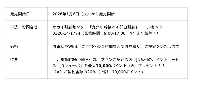 株式会社サカイ引越センター(本社:大阪府堺市 代表取締役社長:田島 哲康、以下「サカイ引越センター」)は、九州旅客鉄道株式会社(本社:福岡県福岡市 代表取締役社長:古宮 洋二、以下:「JR九州」)と連携し、JR博多駅とJR鹿児島中央駅間の九州新幹線を使用した即日引越プラン『九州新幹線de即日引越』を2026年1月6日(火)から発売を開始します。
