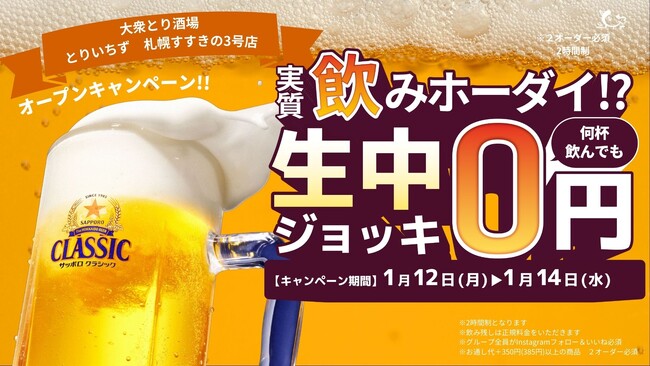 大衆とり酒場「とりいちず 札幌すすきの3号店」2026年1月12日(月・祝)グランドオープン!生ビール何杯飲んでも0円キャンペーンを開催