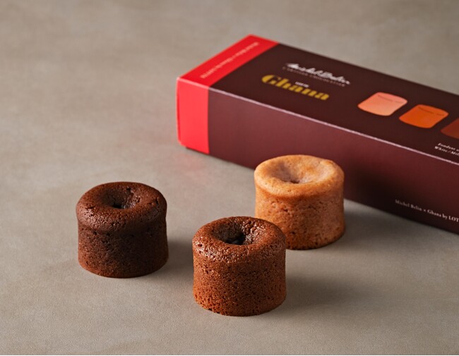 「フォンダン オ ガーナ(3個入)2,700円」フランスの家庭で日常的に食べるお菓子として親しまれ、ブラン氏のスペシャリテである「モワルーショコラ」をガーナチョコレートでアレンジしました。モワルーはフランス語で“やわらかい”という意味で、生地の中に忍ばせたチョコレートのなめらかで濃厚な味わいが特徴です。今回は、生地と中に挟んだチョコレートにガーナチョコレートを使用し、ミルク感たっぷりのこく深い味わいを閉じ込めた、ブラン氏のこだわりが息づく特別な一品です。ミルク、ブラック、ホワイトの3種のフレーバーをセットで販売いたします。食べ方は常温のまま、しっとりした生地と口の中でほどけるように溶けていくチョコレートのハーモニーをお楽しみください。