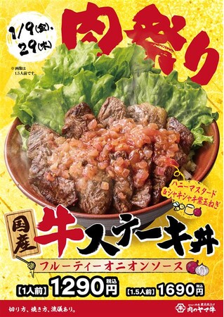 株式会社肉のヤマ牛(本社:東京都渋谷区、代表取締役社長 柏原 聡)が展開する、食の感動体験を追求し、切りたて・焼きたてにこだわる炭火仕上げ肉のヤマ牛は、人気商品をお得に味わえる“肉祭り”を2026年1月9日(金)と29日(木)の2日間開催します。同日には、新商品『国産牛ステーキ丼 フルーティーオニオンソース』を販売します。