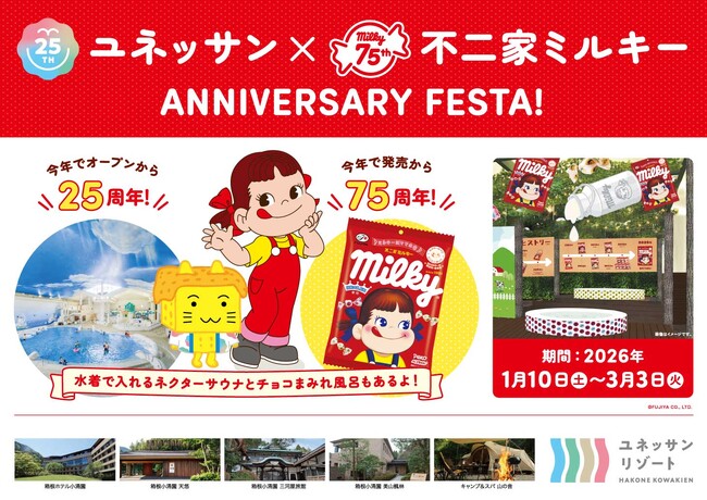 2026年元日に開業25周年を迎えた箱根小涌園ユネッサン(所在地:神奈川県足柄下郡箱根町ニノ平1297、支配人:松山 元信 以下:ユネッサン)では、株式会社不二家(所在地:東京都文京区大塚2-15-6、代表取締役社長:河村 宣行 以下:不二家)とのコラボレーションイベント「ユネッサン×ミルキー ANNIVERSARY FESTA!」を開催し、【温泉入浴】に【飲食】【キャンペーン】を加えた3つのコンテンツを展開いたします。