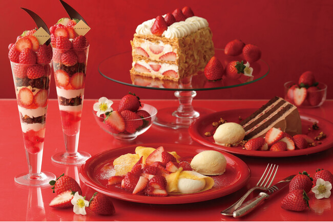 国産苺、苺アイス、フランボワーズ・マスカルポーネクリームなど何層にも重ねた「苺のパフェ」と日比谷シャンテ限定の「あまおう苺のナポレオンパフェ」、2つのパフェをメインに、シグネチャーの「KIHACHIのナポレオンパイ」、たっぷり苺を添えた「苺のクレープ バニラアイス添え」、ほろ苦いカカオの風味が苺の甘酸っぱさを引き立てる「苺のショコラショートケーキ バニラアイス添え」など、個性豊かな苺スイーツが全店に登場します。