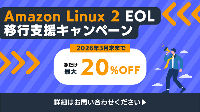 この度、当社は AWS 環境で広く利用されているオペレーティングシステム Amazon Linux 2 のサポート終了(EOL:End-of-Life)に向け、移行支援を強化した「Amazon Linux 2 EOL 移行支援キャンペーン」を開始いたします。本キャンペーンでは、Amazon Linux 2 環境からの移行支援サービスを通常価格から10%OFFで提供いたします。