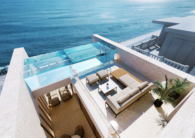 最上階にはアクリル製のインフィニティプールを設置。まるで海へとそのまま滑り込むかのような没入感とともに、一面に広がる相模湾の海景を堪能できます。