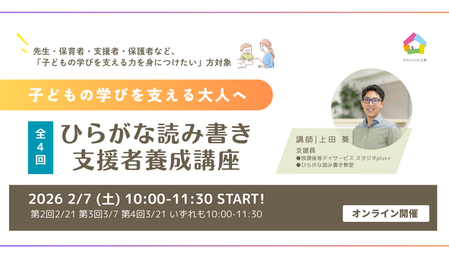 NPO法人ダイバーシティ工房(本社:千葉県市川市)は、2026年2月より、子どものひらがな読み書きに関する理解と具体的な支援方法を学ぶ 全4回のオンライン講座「ひらがな読み書き支援者養成講座」 を開講します。