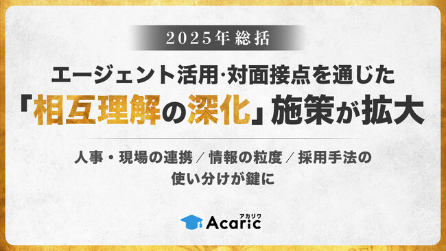 博士人材をはじめとする大学院生・研究者の採用支援を行う株式会社アカリク(本社:東京都渋谷区、代表取締役:山田 諒)は、研究職・高度専門人材の新卒採用に関する2025年の総括として、アカリクの採用支援実績において、新卒人材紹介サービス(エージェント)の利用拡大、対面イベントおよび対面の個社カスタマイズイベントの開催増加など、相互理解の深化を重視した採用施策への投資が顕著に増加していることを発表いたします。