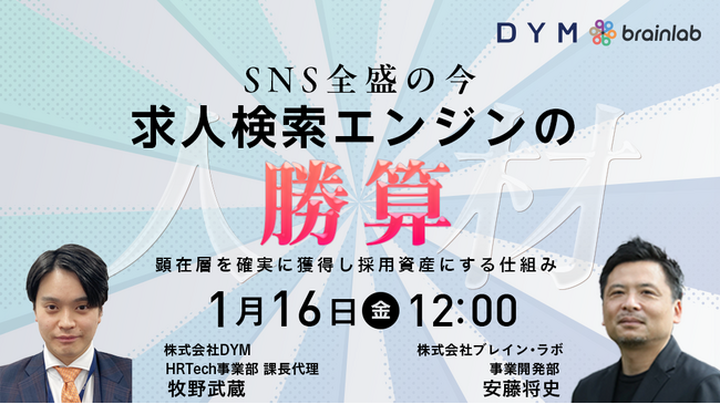 株式会社ブレイン・ラボは、Webマーケティングに強みを持つ株式会社DYMと2026年1月16日(金) 12:00より、オンラインセミナー『SNS全盛の今、あえて選ぶ「求人検索エンジン」の勝算~顕在層を確実に集め、LINEで資産化する集客・育成・定着の仕組み』を共同開催いたします。