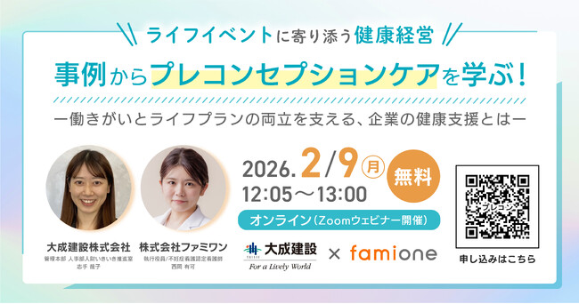 「子どもを願うすべての人によりそい 幸せな人生を歩める社会をつくる」をビジョンに掲げ、法人の従業員向け福利厚生や自治体の住民向け支援を行うヘルスケアサポートサービス「ファミワン」 https://famione.com/benefit/ などを展開する株式会社ファミワン(本社:東京都渋谷区、代表取締役:石川 勇介)は、2026年2月9日(月)に企業のご担当者様を対象とし、「ライフイベントに寄り添う健康経営 事例からプレコンセプションケアを学ぶ!-働きがいとライフプランの両立を支える、企業の健康支援とは-」をテーマに無料オンラインセミナーを開催いたします。