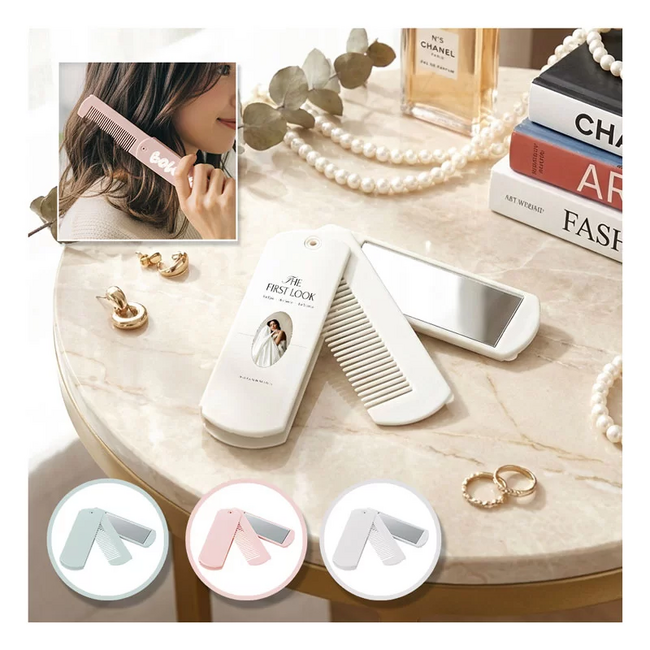 本体はコームとミラーが一体化した折りたたみ仕様で、外出先での髪のお直しや、ちょっとしたメイク直しにも便利な実用性の高いアイテムです。折りたたむと薄型になり、ミニバッグやポーチ、シャツの胸ポケットにもすっきり収納できるため、毎日持ち歩きたくなる携帯コームとしてもおすすめです。