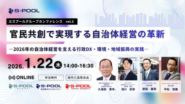 株式会社エスプール(本社:東京都千代田区、代表取締役会長:浦上壮平)は、自治体職員および自治体関係者を対象としたオンラインカンファレンス「官民共創で実現する自治体経営の革新―2026年の自治体経営を支える行政DX・環境・地域振興の実践―」を、2026年1月22日(木)に開催いたします。