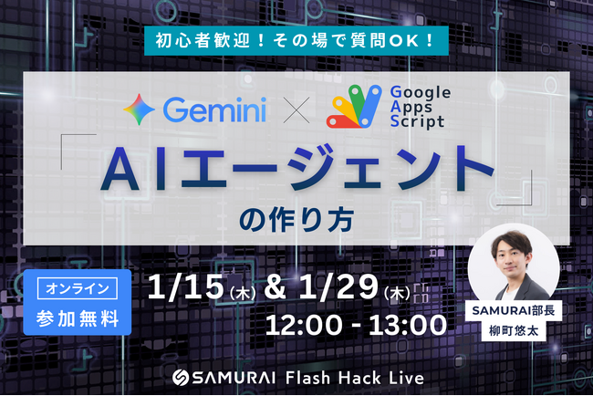 企業のDX支援およびIT教育を展開する株式会社SAMURAI(本社:東京都港区、代表取締役:羽田吾立)は、2026年1月15日(木)および1月29日(木)の2日程にて、Google Apps Script(GAS)とGemini APIを組み合わせたAIエージェント開発を学ぶオンラインセミナーを開催いたします。