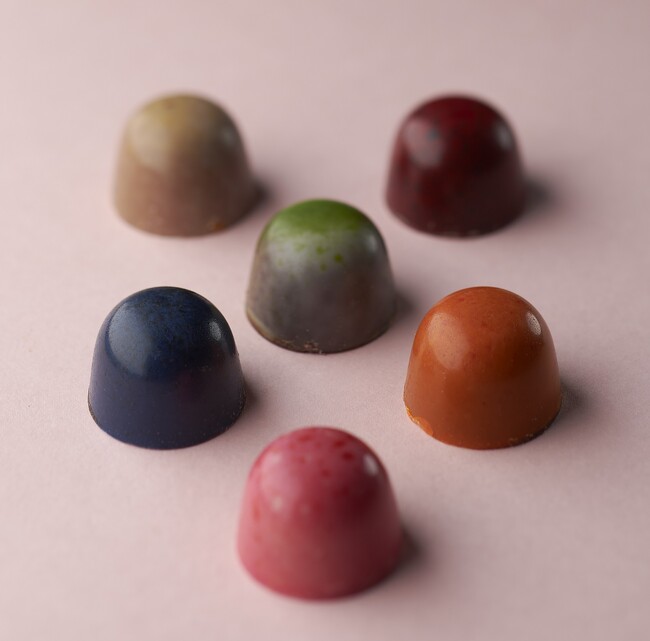 ゆずとセージのパートドフリュイ入りガナッシュ、.バジルと苺のパートドフリュイ入りガナッシュ、.ホットワインガナッシュとスペキュロスのプラリネ、ブロンドチョコレートと花と果実のガナッシュ、ピスタチオ100%使用プラリネ、レモンバーベナとパッションフルーツのガナッシュ、(そごう・西武限定)ライムのキャラメルムーとミントのガナッシュ